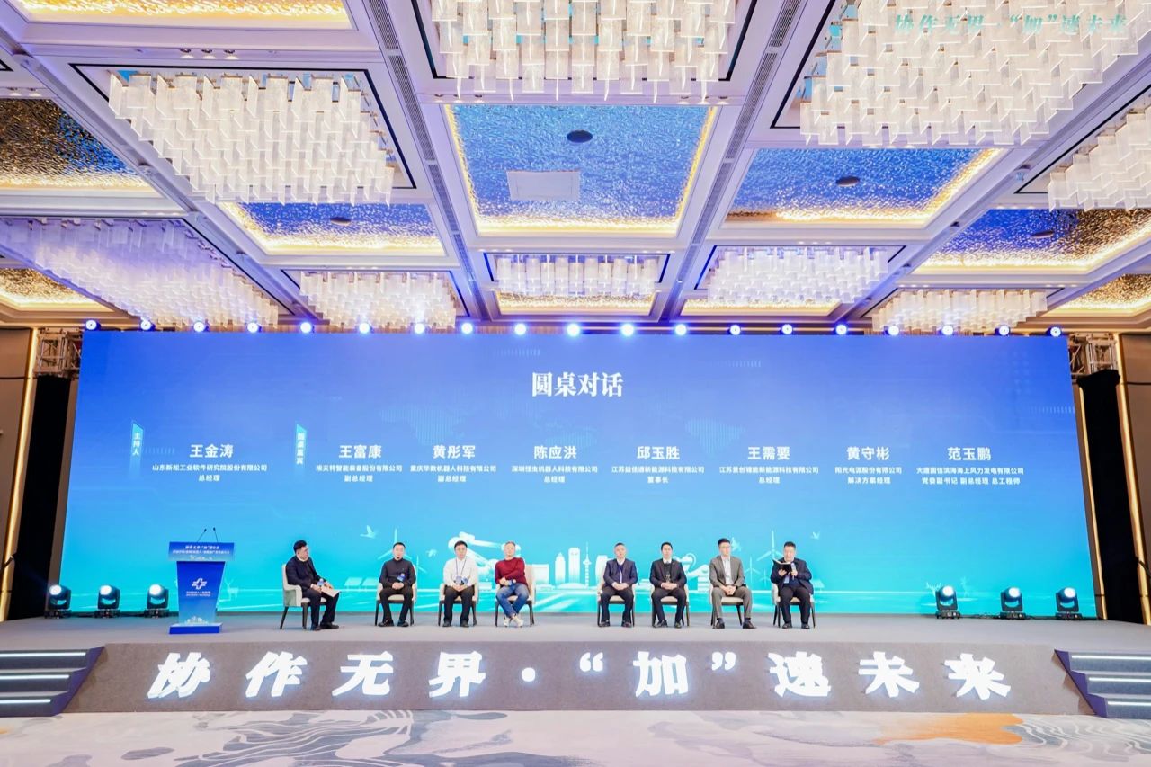 埃夫特智能装备股份有限公司副总经理王富康、重庆华数机器人科技有限公司副总经理黄彤军、深圳怪虫机器人科技有限公司总经理陈应洪、江苏益佳通新能源科技有限公司董事长邱玉胜、江苏景创锂能新能源科技有限公司总经理王需要、阳光电源股份有限公司解决方案经理黄守彬、大唐国信滨海海上风力发电有限公司党委副书记副总经理总工程师范玉鹏共同参与,并就新能源行业未来走向,机器人解决方案现状、合作现状、升级创新方向、合作路径等议题同台共话。本次对话由山东新松工业软件星空官网股份有限公司总经理王金涛主持。