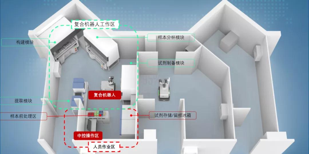 医学检测复合机器人以实际的检测设备为依托,通过自主开发中控系统,在实验室内进行模块化搭建,柔性连接各类仪器设备。