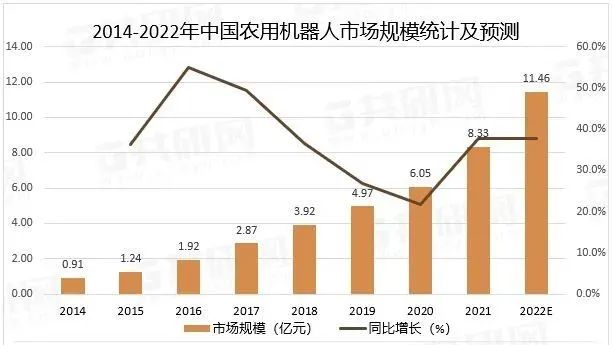 伴随着电子技术和计算机技术的发展,智能机器人已经在很多领域得到了广泛的应用,2014年我国农用机器人市场规模为0.91亿元,2020年我国农用机器人市场规模增长至6.05亿元,预计2022年中国农用机器人市场规模将达到11.46亿元。