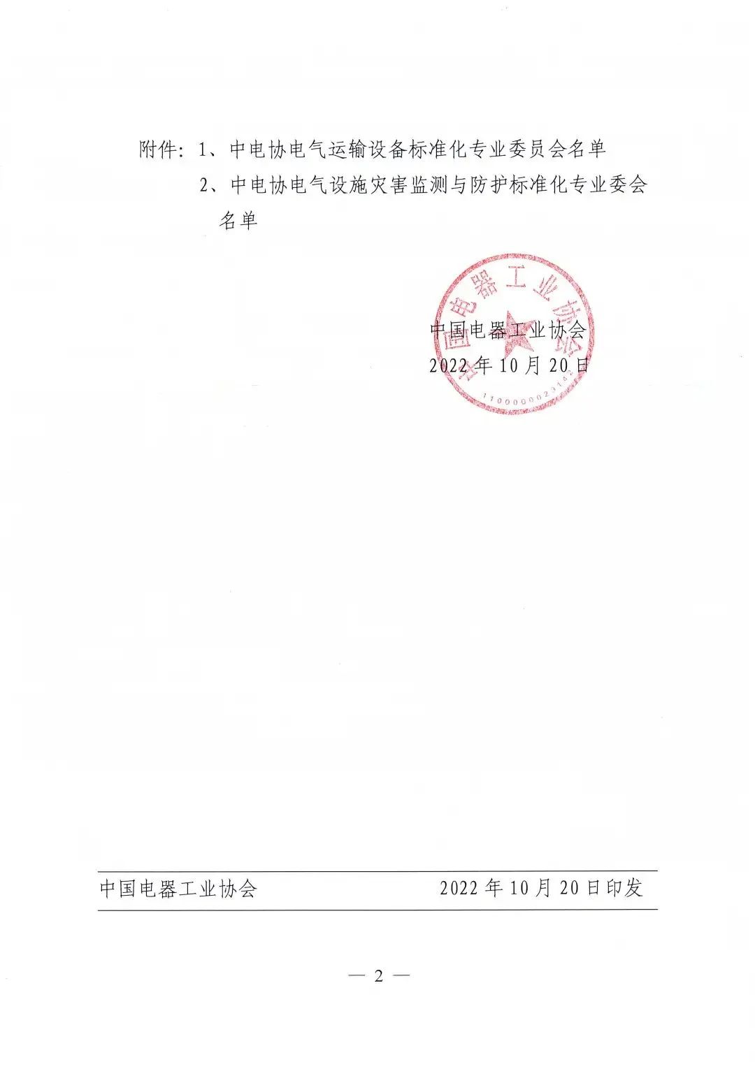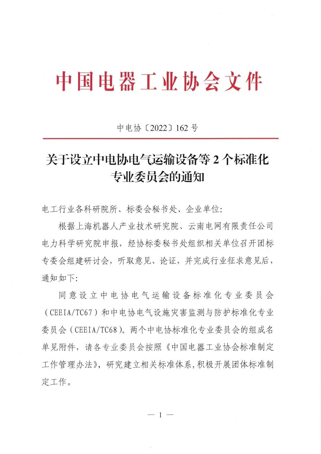 2022年10月20日,中电协[2022]162号文件下达了《关于设立中电协电气运输设备等2个标准化专业委员会的通知》,同意设立中电协电气运输设备标准化专业委员会(CEEIA/ TC67),秘书处挂靠单位为星空官网(中国)机器人有限公司官网。