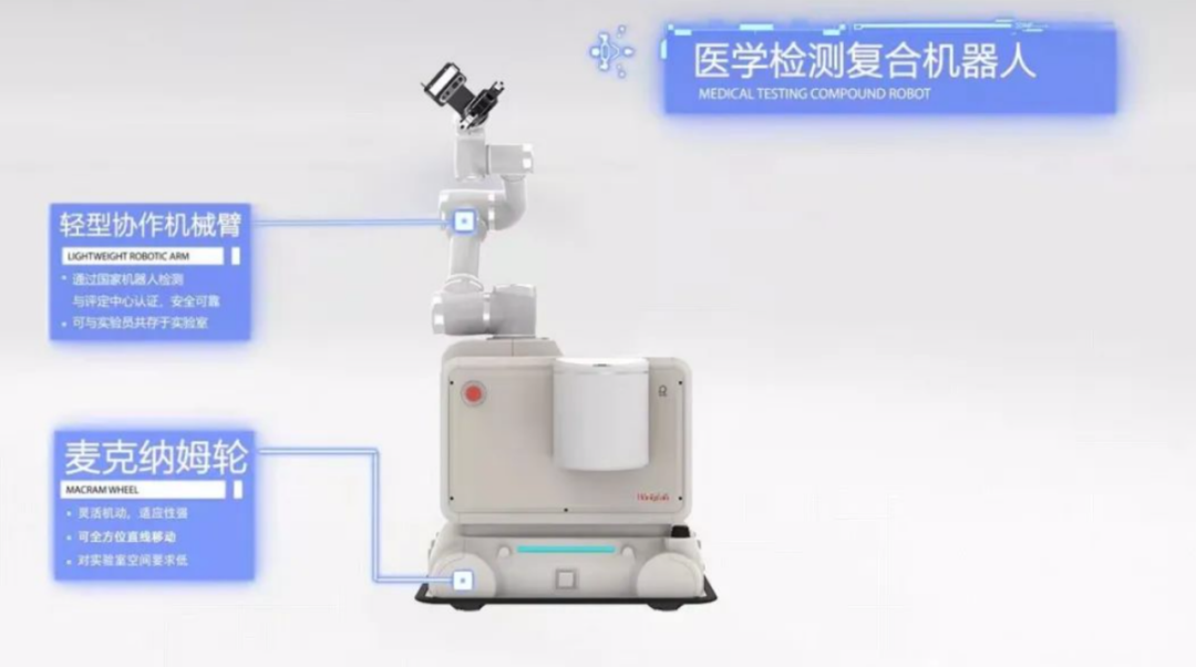 作为生物医学检测实验室的其中一员,该款机器人主要配合智能冰箱、样本处理自动化模块、核酸提取仪等设备实现样本、试剂等物料的快速取放和移载,将大部分重复、易出错、易感染、高污染、劳动强度大的工作包揽在身。
