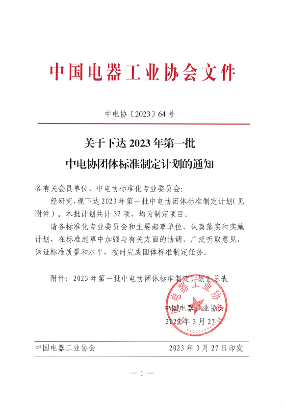 2023年3月27日,由中电协电气场所用机器人安全与检测标准化专业委员会提出的《固定式自动充电装置(机器人)安全技术规范》、《建筑机器人分类》、《建筑机器人通用技术条件》、《建筑机器人通信架构及协议导则》、《重载工业机器人通用技术条件》、《家用和类似用途服务机器人智能化评价规范》、《机器人抓取测评规范》七项团体标准,正式获得中国电器工业协会批准立项。