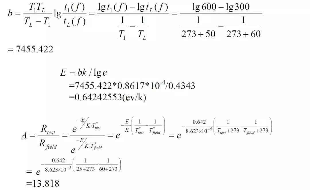 从公式中可以看出,激活能越大,加速系数也越大,越容易被加速失效,加速试验效果越明显。如果,在激活能确定的情况下,温度差越大,加速系数也越大。但是,这里要特别注意,执行加速测试的前提时,增加应力产生相同的失效模式,如果加速应力超出产品、材料本身的极限温度范围,可以产生的新的失效模式,那么加速试验得到的加速系数也就没有意义了。