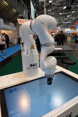 德国宇航中心(Deutsches Zentrum für Luft- und Raumfahrt,简称DLR)展出一款名为HUG(haptic user interface for telemanipulating)的双臂操作系统。 研究人员展示了使用这一系统控制edan进行日常作业。作业内容包括:开冰箱、倒水、玩积木等。这一系统能够很好的解决远程机器人控制问题,例如:太空站中的机器人。