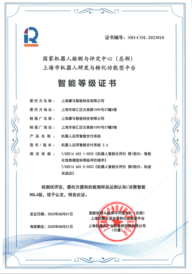 近日,星空官网(中国)机器人有限公司官网(以下简称“星空官网”)为上海摩马智能科技有限公司(以下简称“摩马智能科技”)颁发了智能机器人分级首张工业机器人领域认知/决策RDL4级证书。这表明由摩马智能科技机器人应用交付系统所赋能的工业机器人已满足智能机器人认知/决策RDL4级评价要求,摩马智能科技成为了首家拥有工业机器人认知/决策RDL4级等级证书的企业。